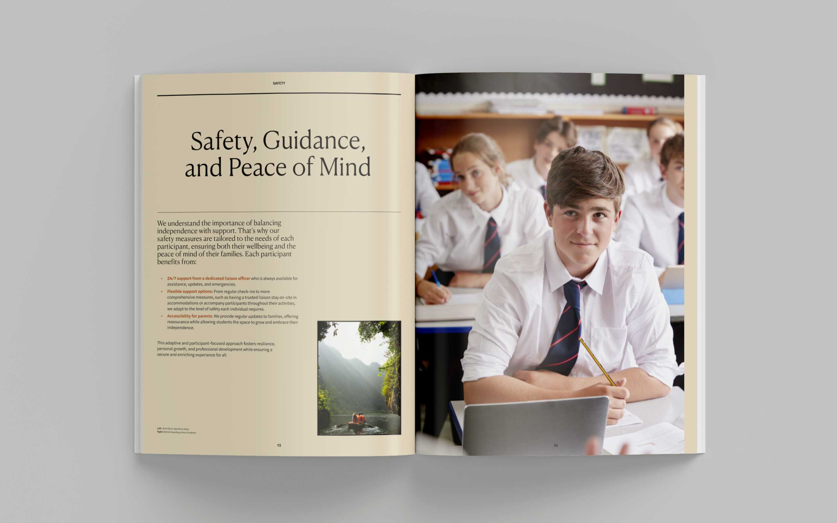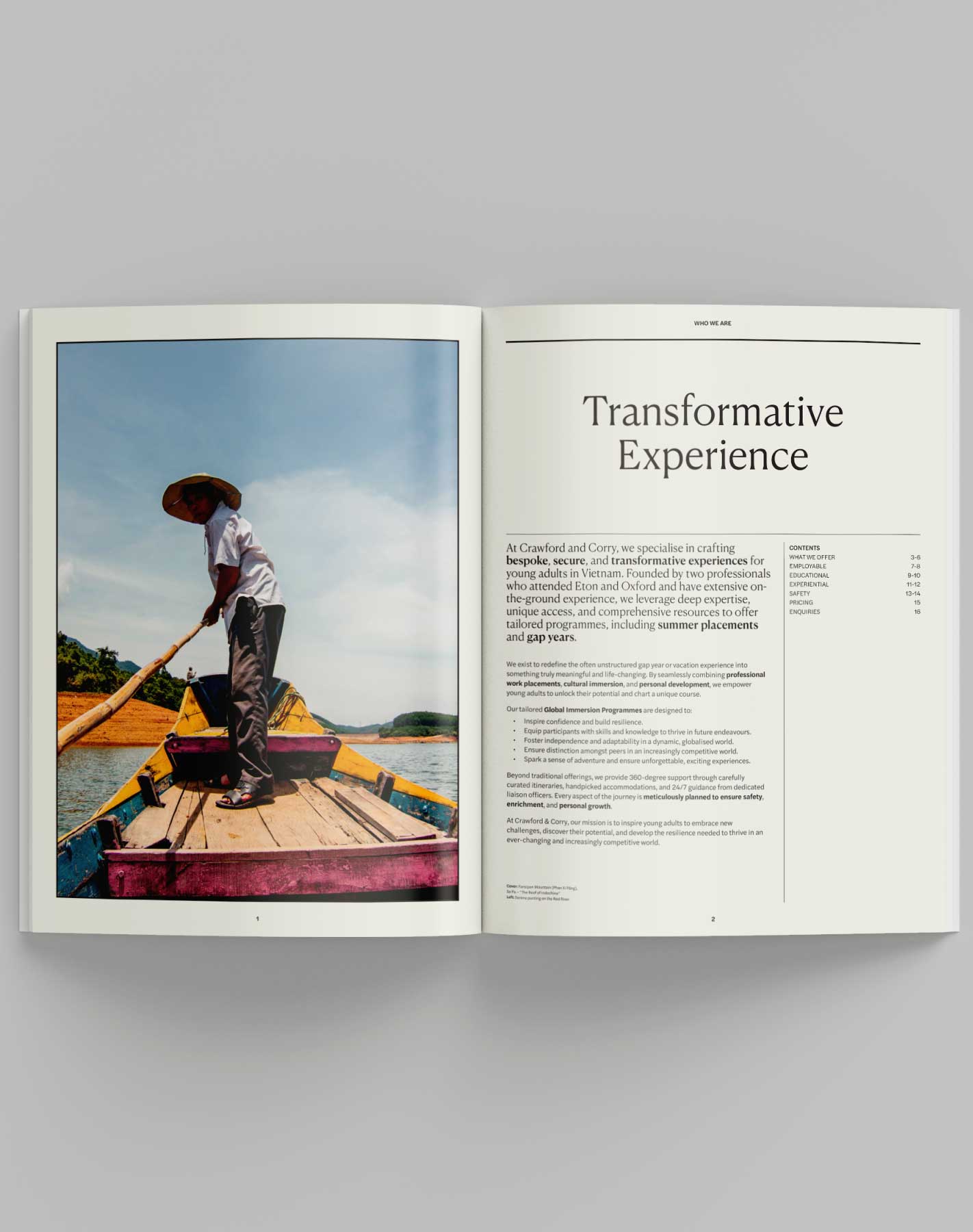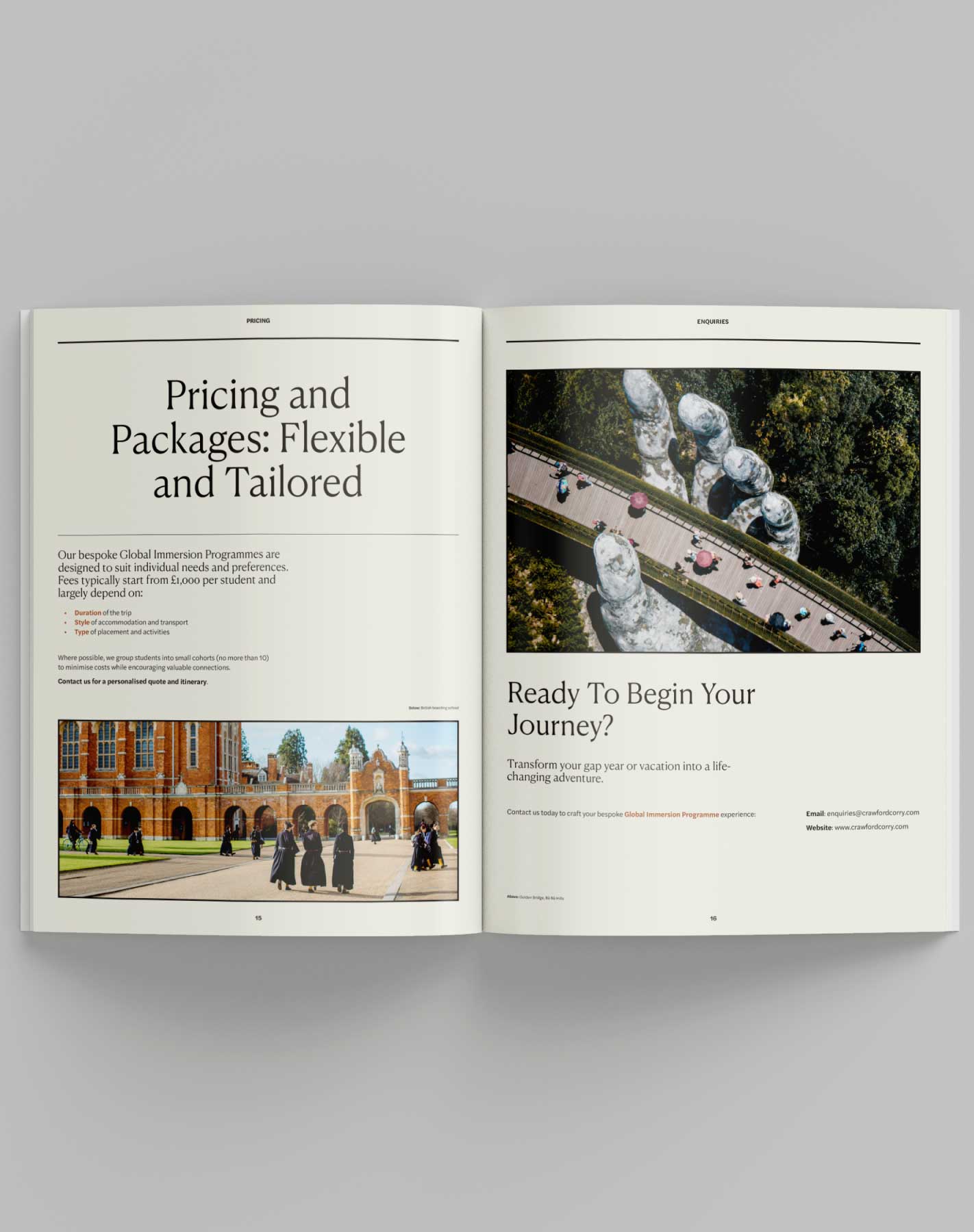 GCS developed a cohesive visual identity, designed a compelling brochure, and crafted engaging copy that captured the depth and ambition of their offering. The result is a brand that feels both aspirational and trustworthy, positioning Crawford & Corry as the definitive choice for young adults seeking meaningful, career-enhancing adventures.