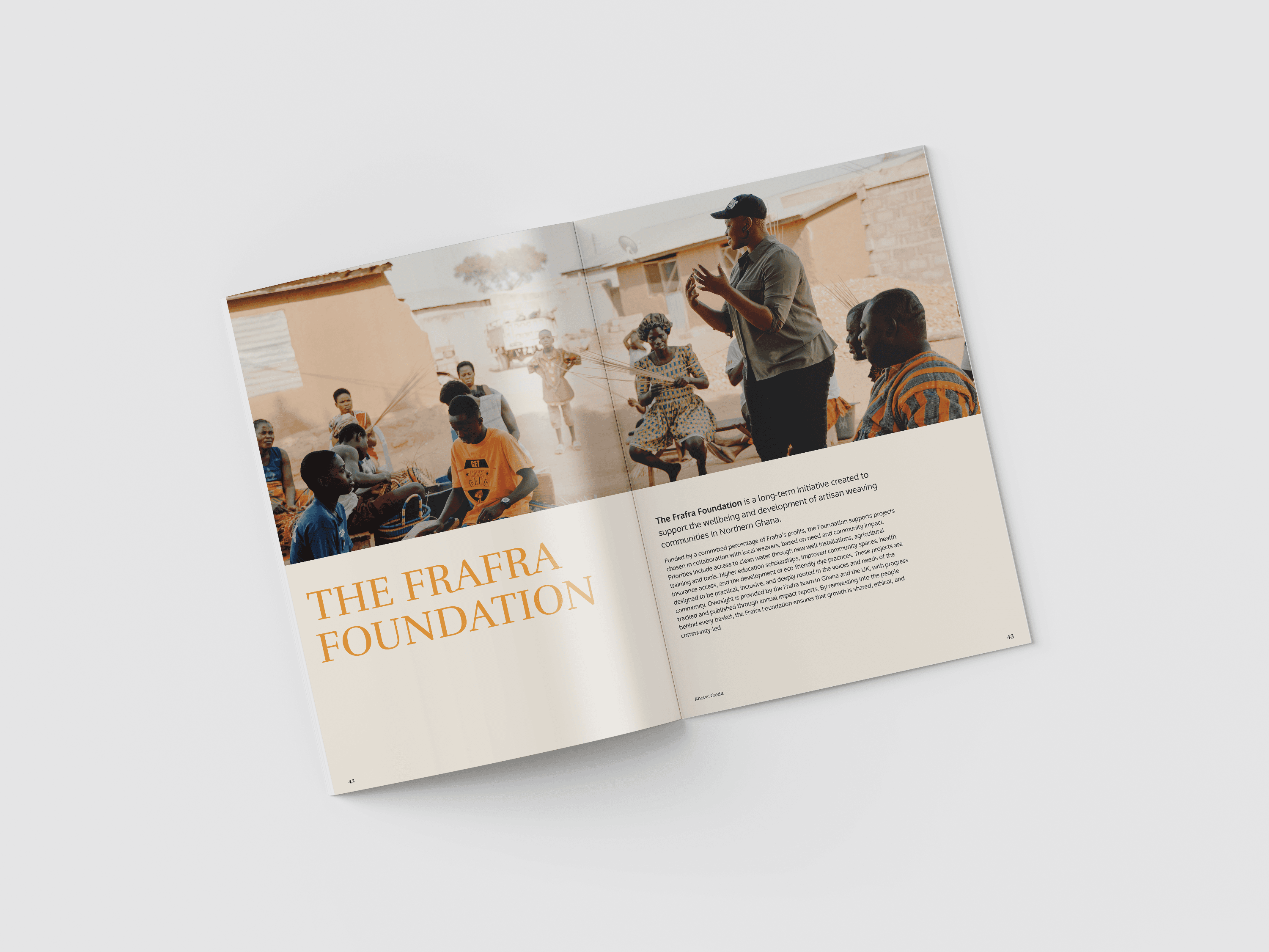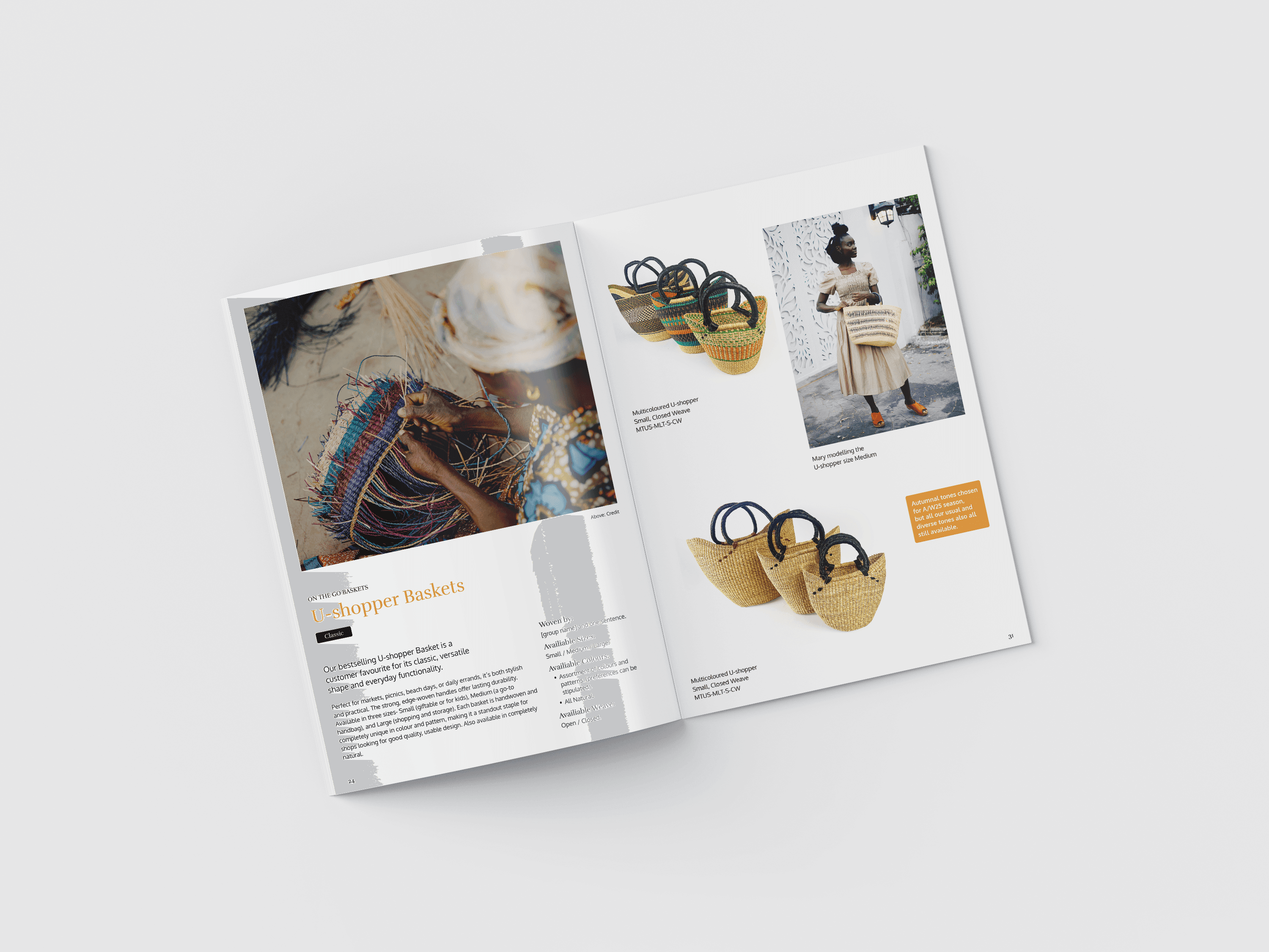 Each section balances clarity for buyers with a strong emotional connection to the craft: from illustrated step-by-step visuals of basket-making, to thoughtful copy explaining materials and processes, to the highlight of the Fra Fra Foundation’s impact. By carefully blending functional ordering details with the beauty of the brand story, the catalogue acts as both a practical resource and a celebration of the people and traditions behind every basket.
