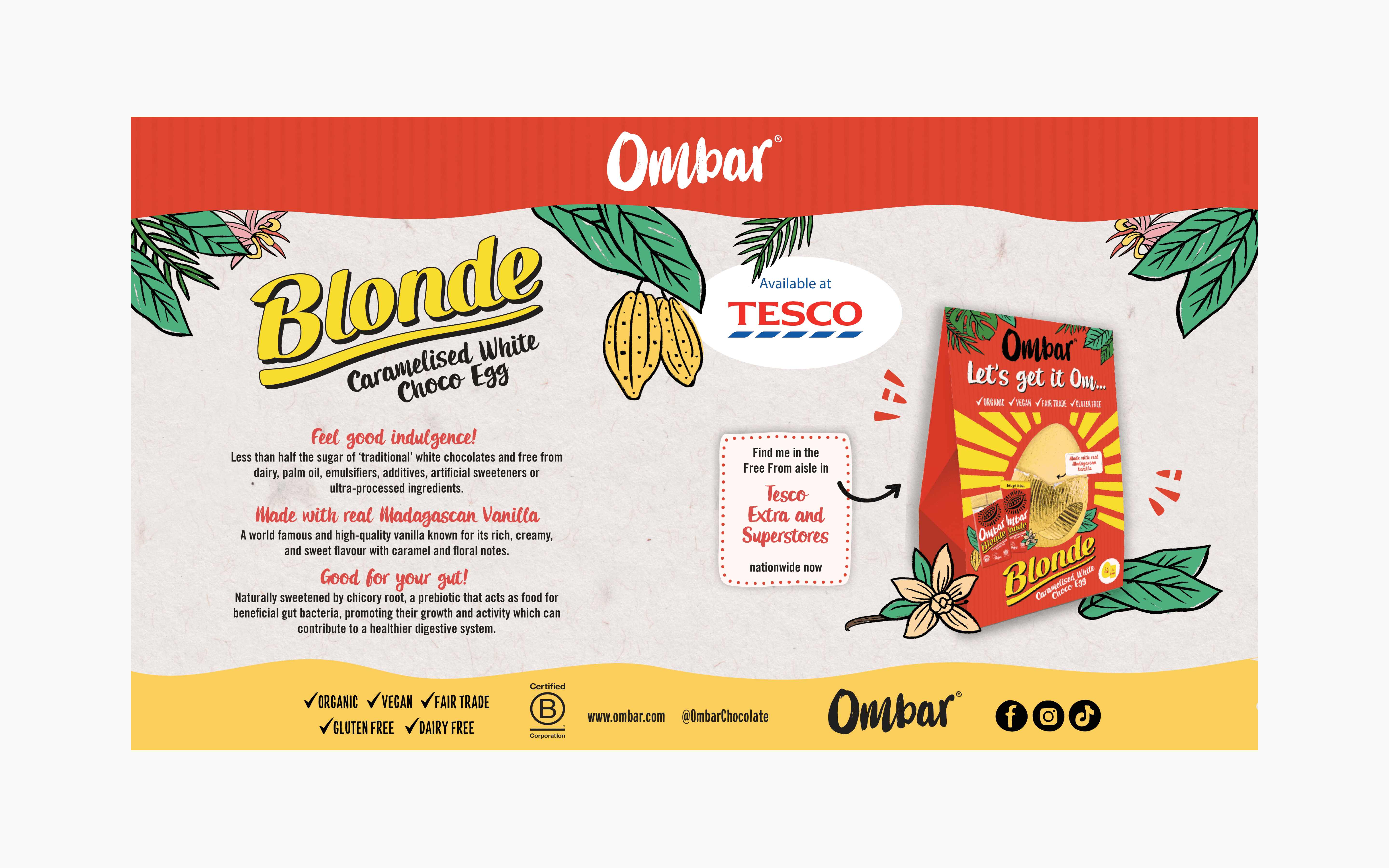 We collaborated with the team to design the artwork for Ombar’s next Easter Egg, alongside a promotional leaflet created exclusively for Tesco to drive awareness and engagement at shelf. Building on this, we also developed a clip strip for their Blonde bar — a key piece of point-of-sale marketing that ensures standout visibility in Tesco stores nationwide.