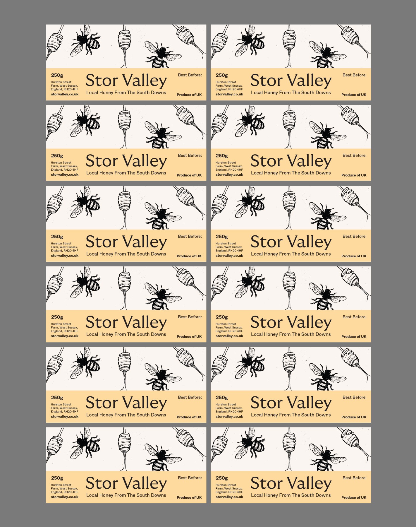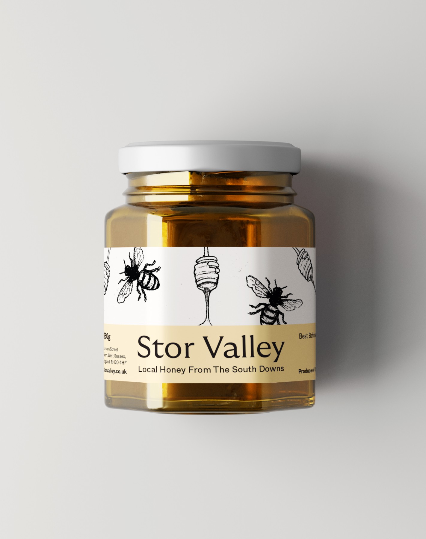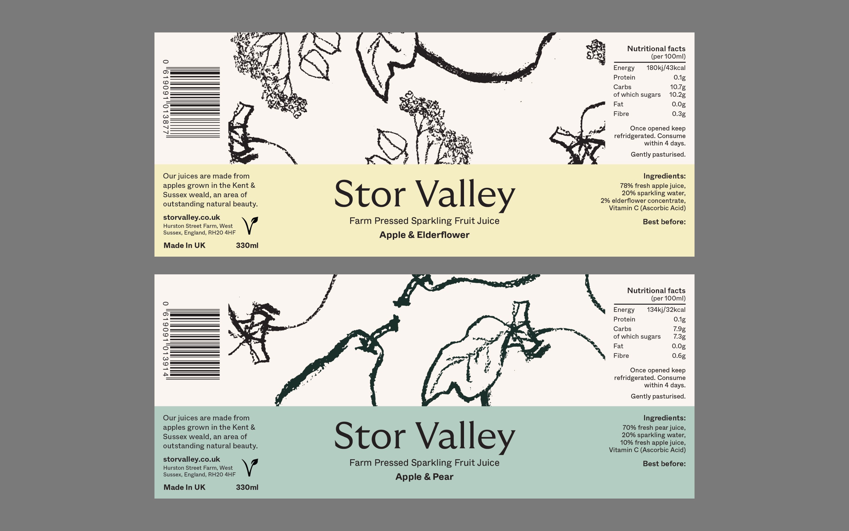 The name draws from The Stor river that rises from chalk and emerges from springs located on the northern slopes of the South Downs. Finding the intersection between elevated brand and their farm shop roots, the identity focuses on elegant contemporary typography, pastel colour blocks and a unique illustrative style. By using charcoal over rough paper the illustrations are able to communicate a full of life, wholesome yet graceful quality. A range of sparkling fruit juice cans and local honey made up an intial product line for Stor Valley to go to market.